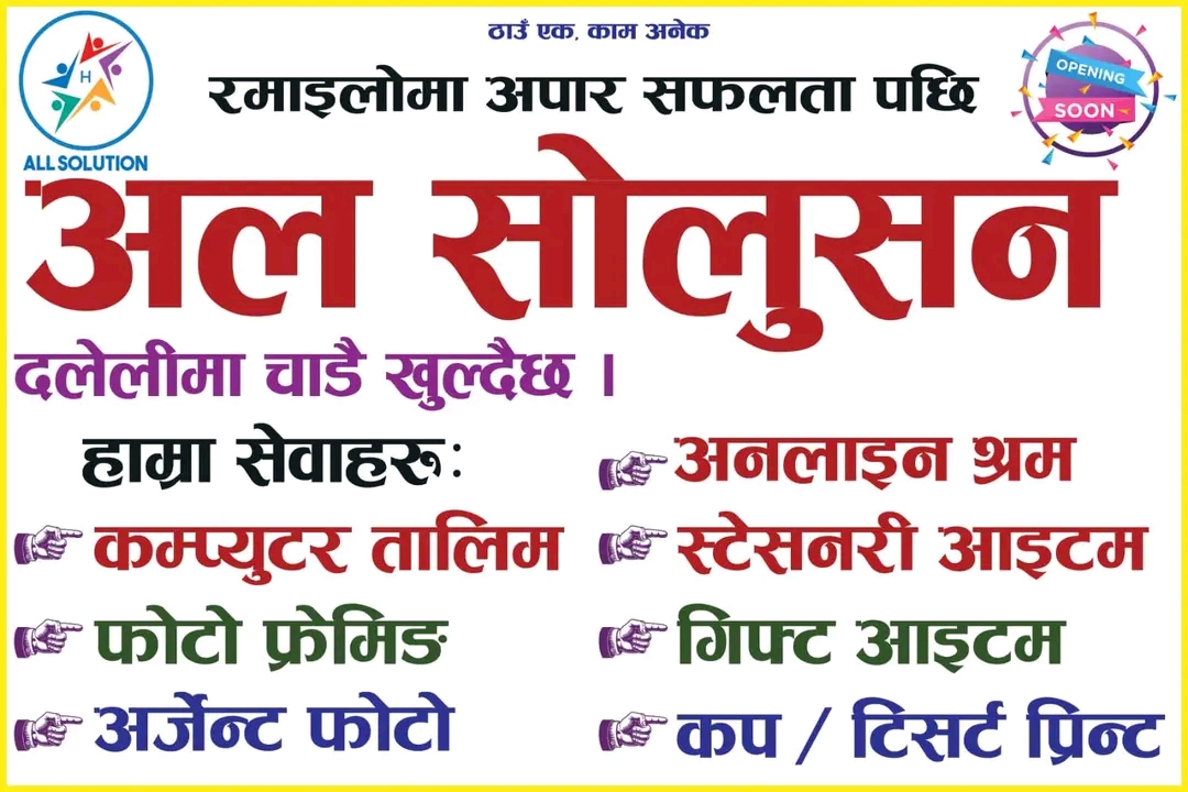 कानेपोखरी, २९ चैत्र । मोरङको रमाइलो बजारमा विगत ६ वर्षदेखि सेवा दिँदै आएको अल सोलुसनले बैशाख १ गतेका दिन नंया बर्षको अबसर पारेर दलेलीमा नयाँ शाखा विस्तार गर्ने भएको छ।